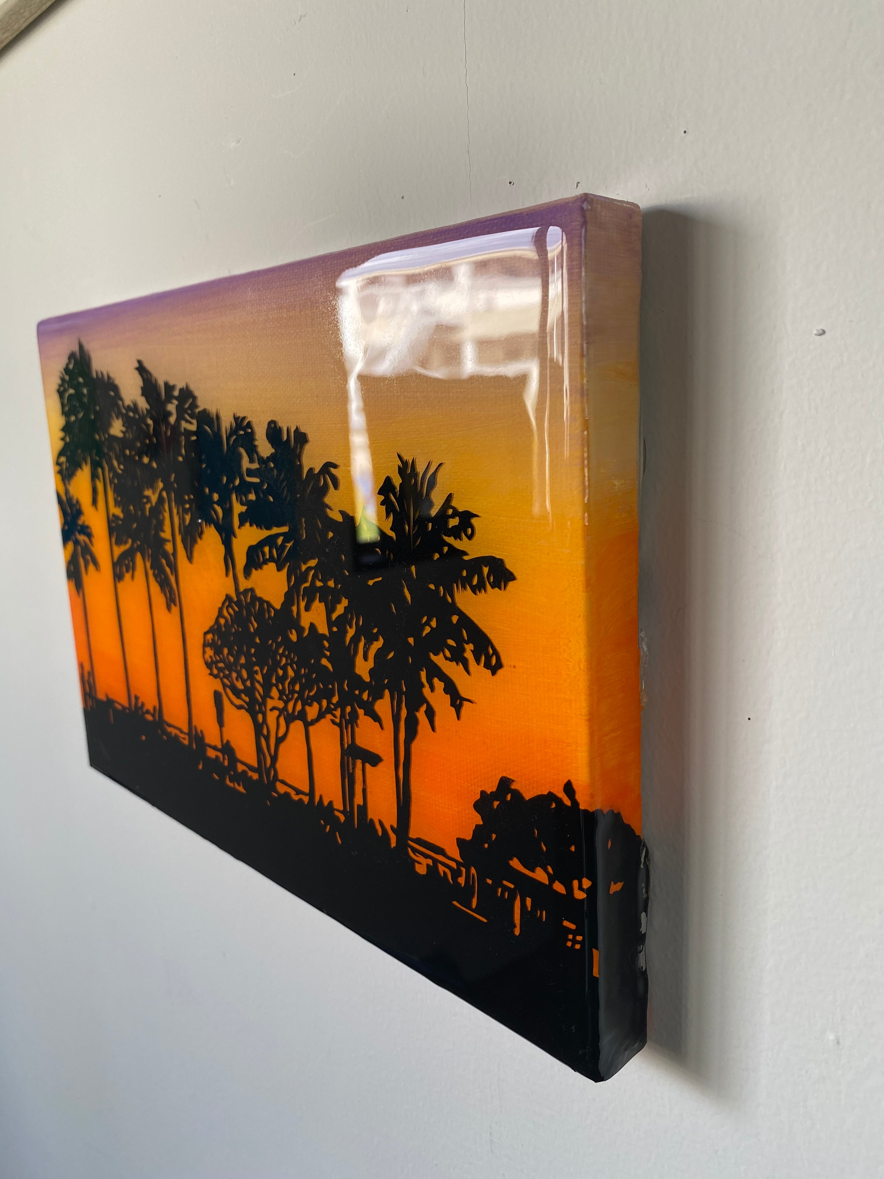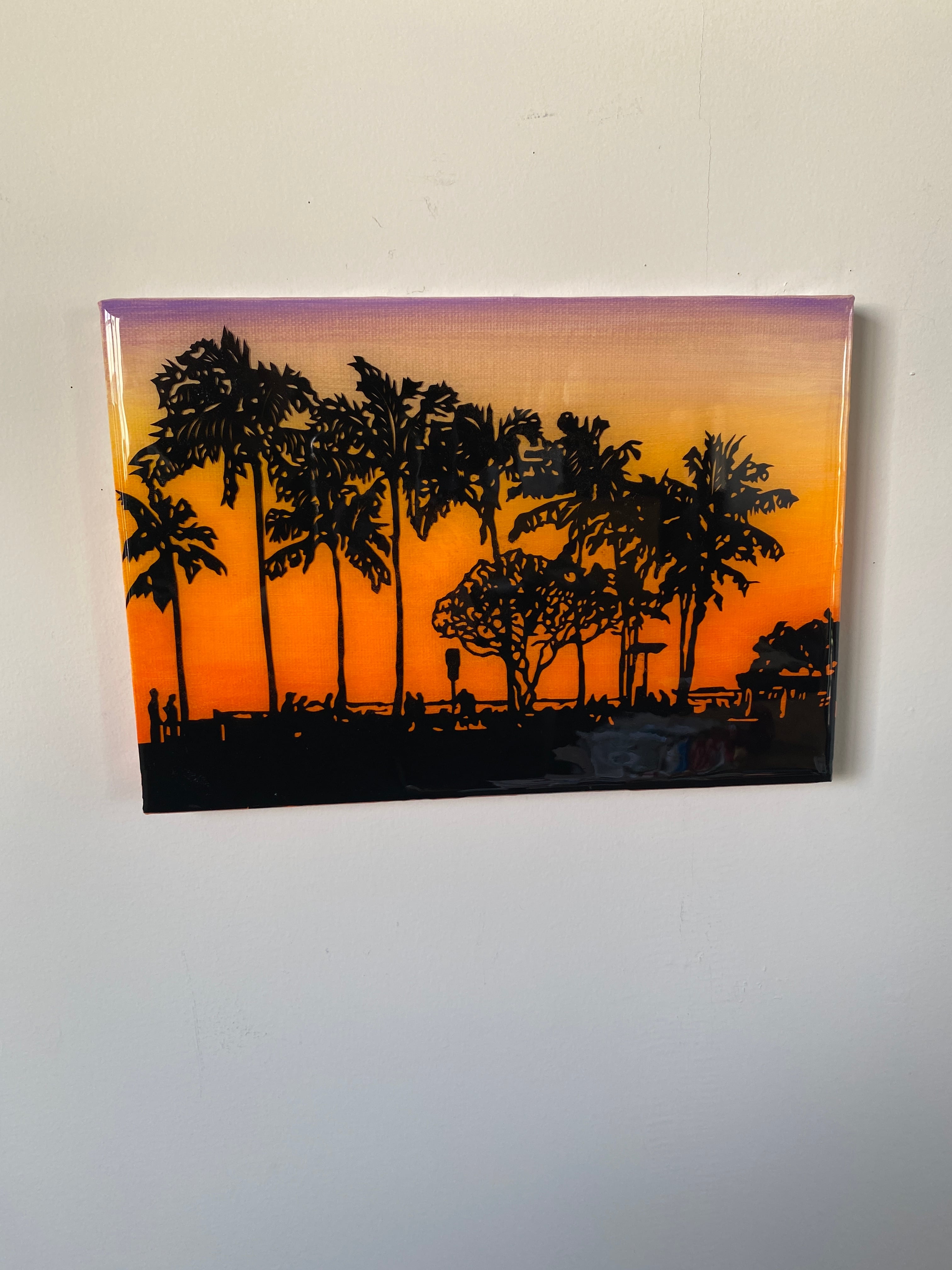 キャンバスをアクリル絵の具で着色し、カッティングシートをカッターナイフ1本で切り、キャンバスに貼り付け、レジンでコーティングしました。