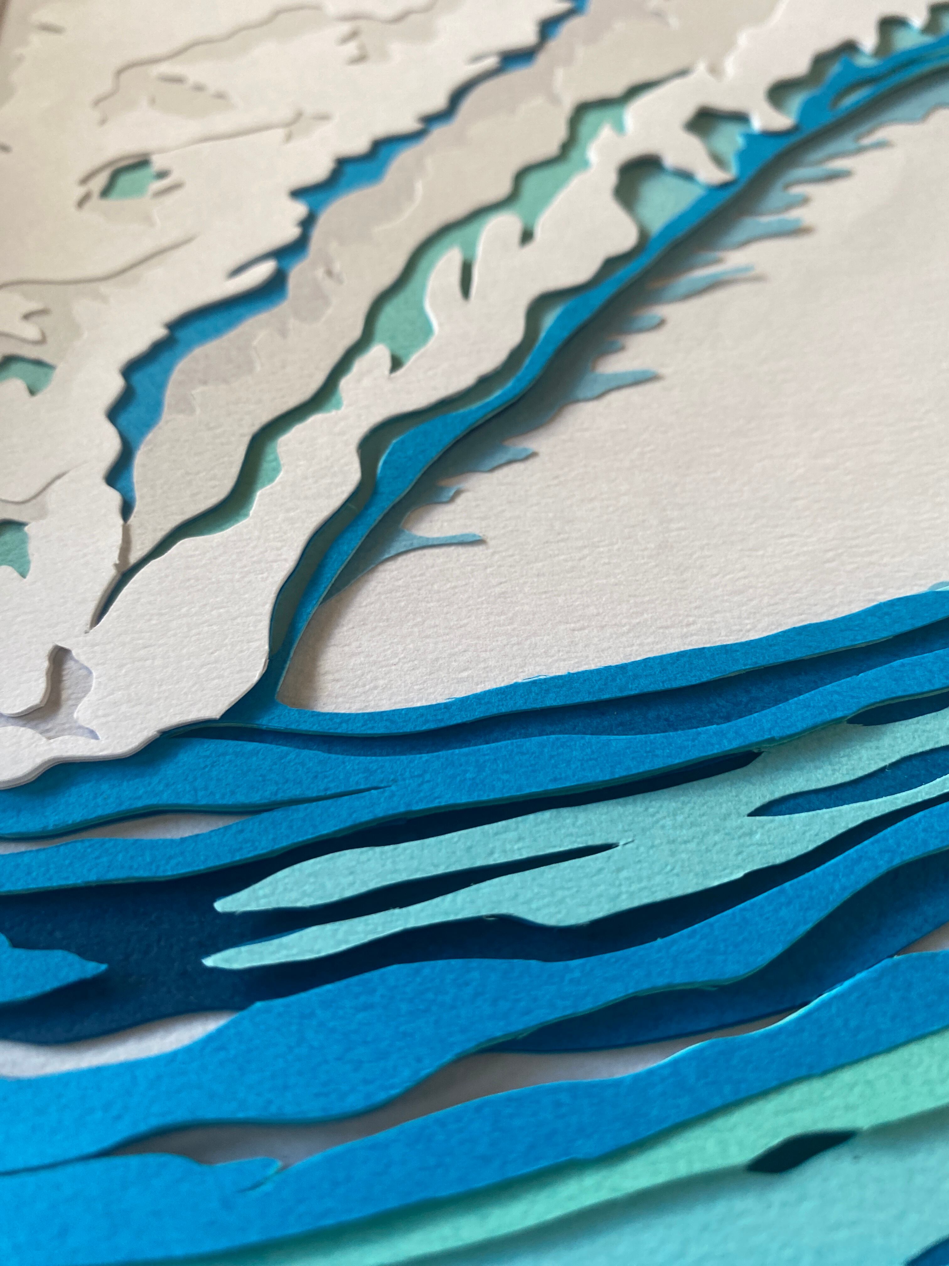 紙を重ねて切る技法で、見る角度によっては立体的に見え、いろんな表情が楽しめます。